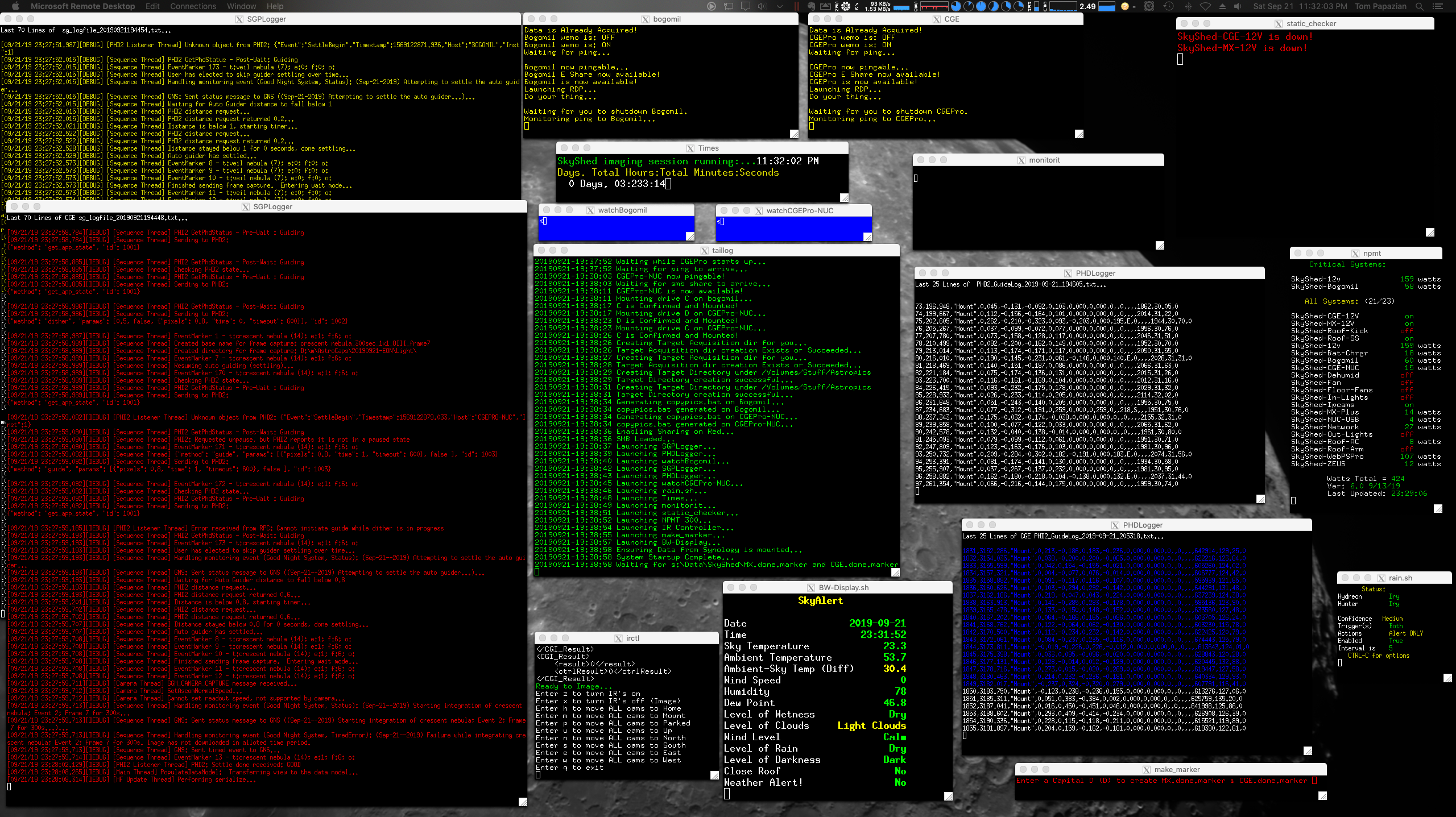 I had decent data acquisition. Automation scripts v5 built and deployed. Startup sequencing automation in place and working. Shutdown automation is copying my data back to another computer inside my house, parking the telescope and closing the roof. Finally automation will shut everything else running off.