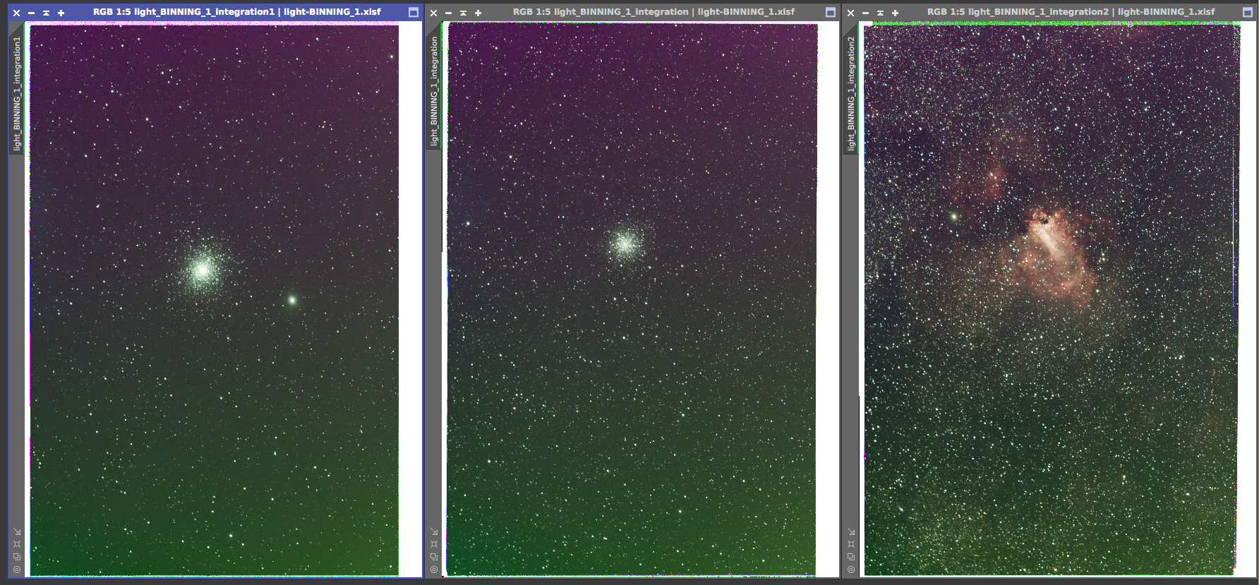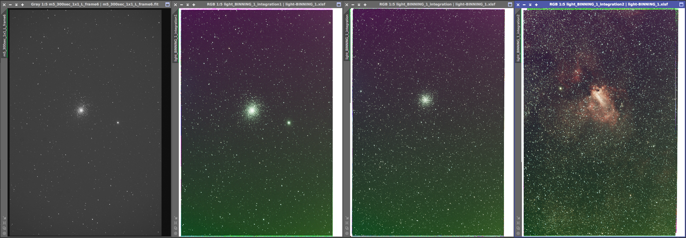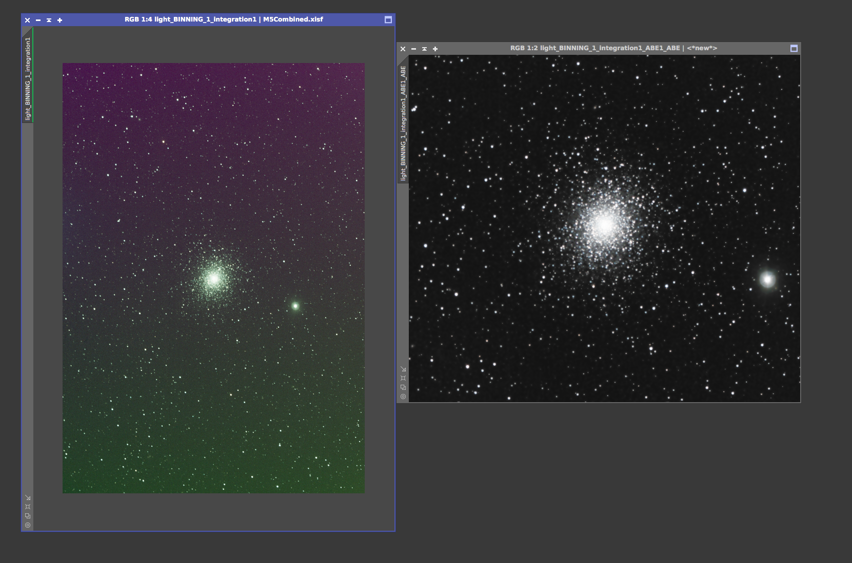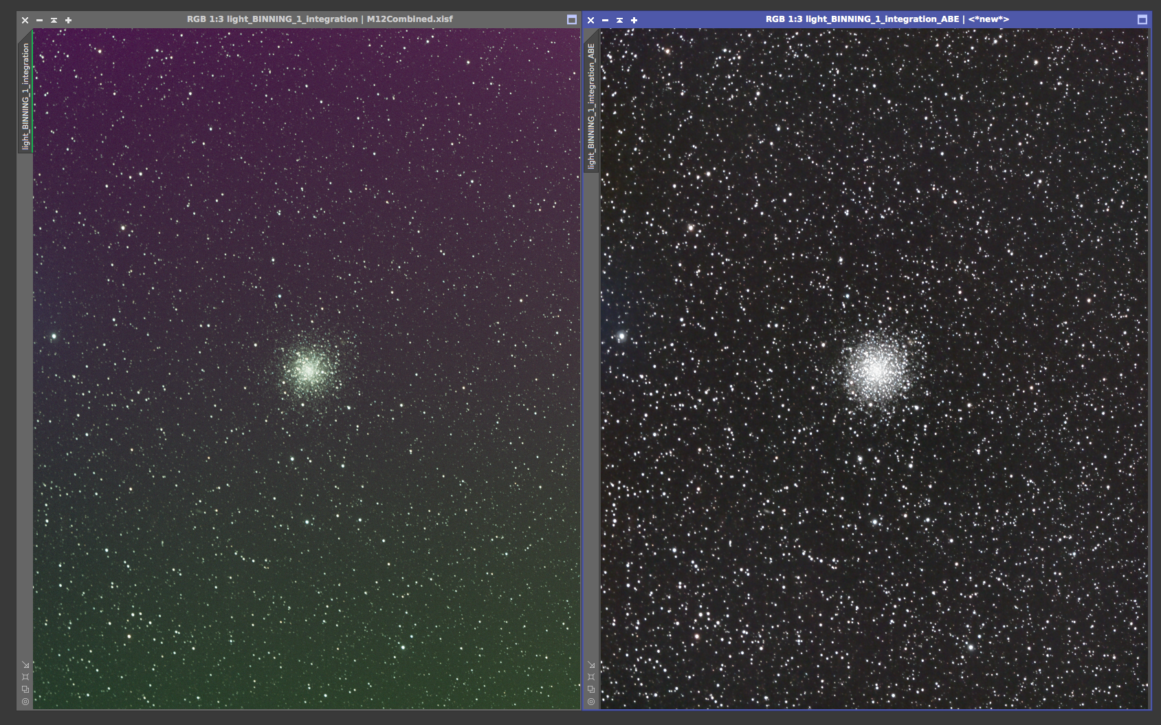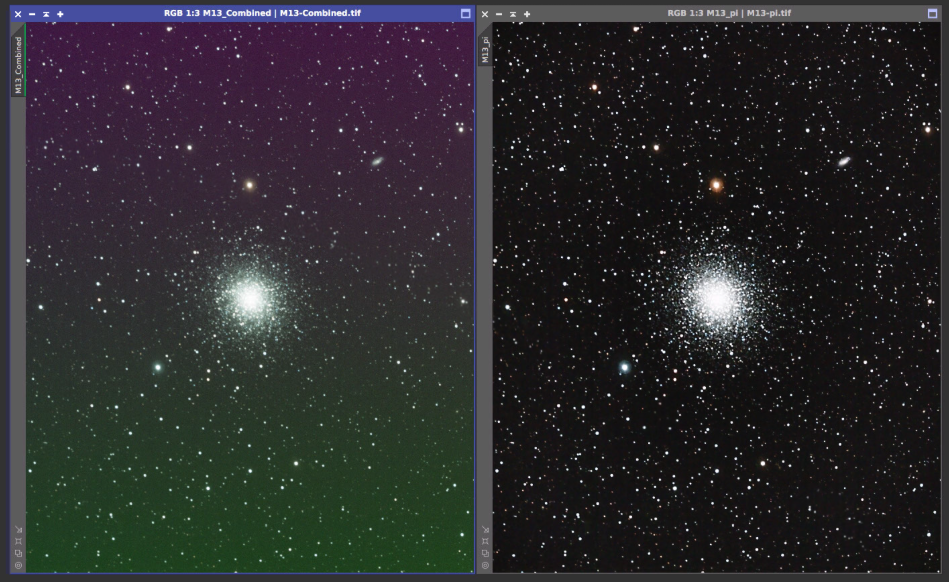 M13 Hercules Globular Cluster On the left is the 12x5min OSC subs calibrated and combined with a screen stretch to see the faint stars. On the right is the processed version from June 20, 2017