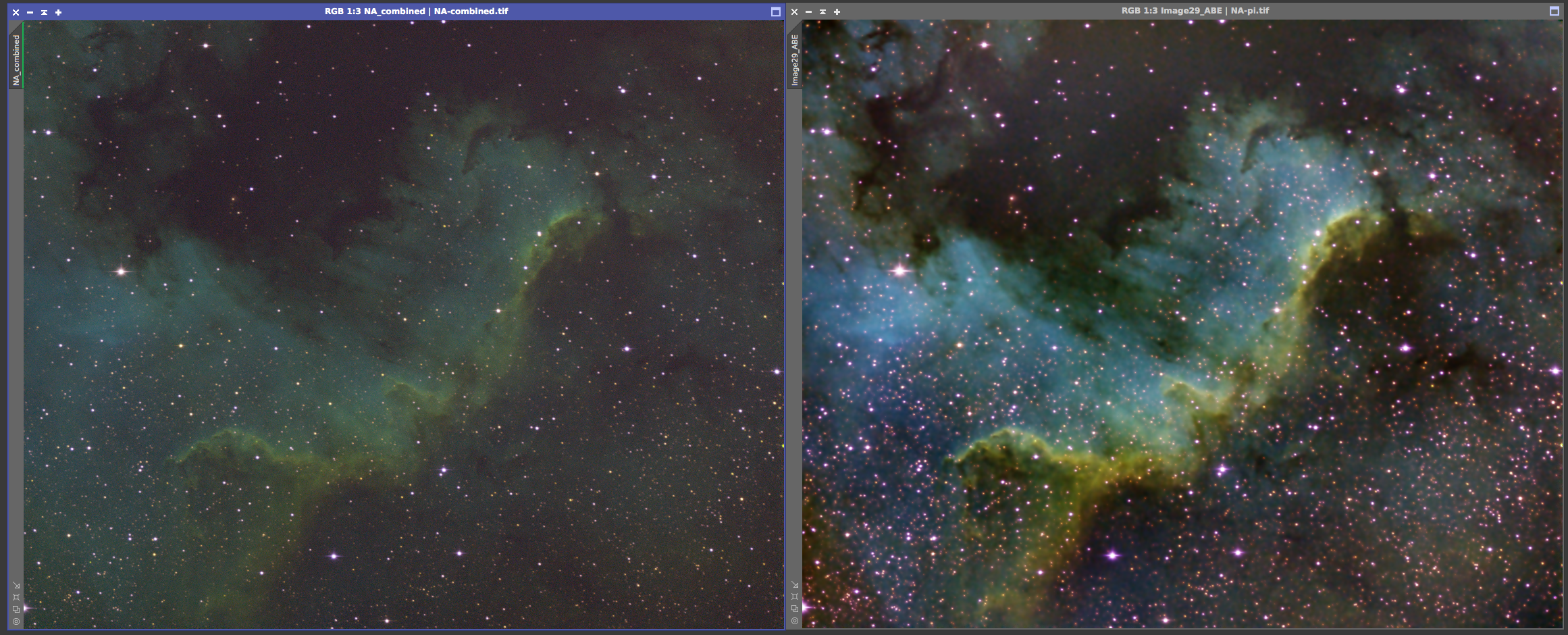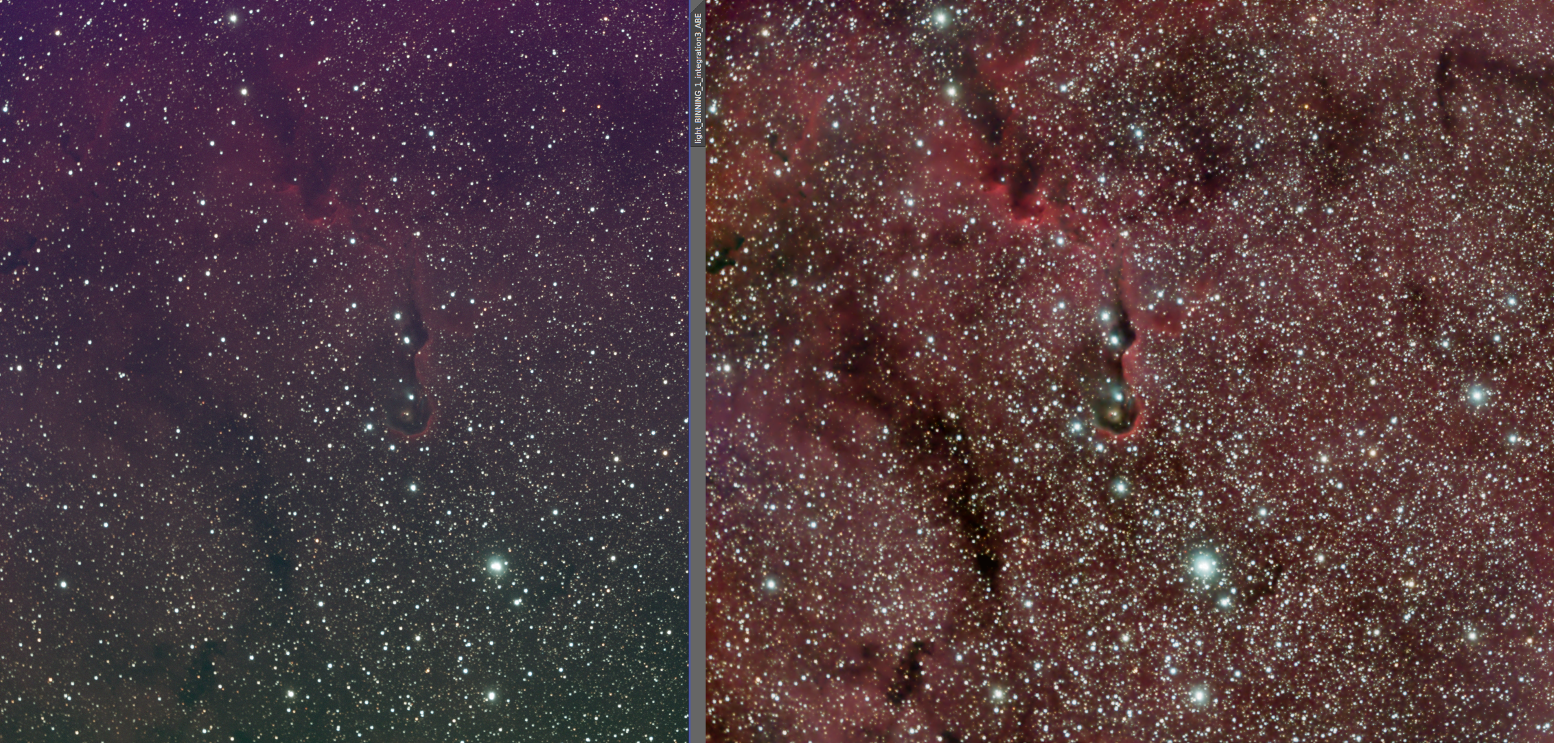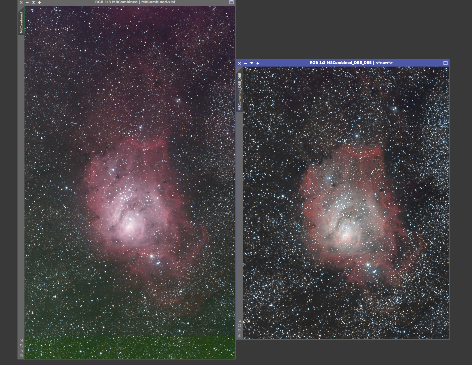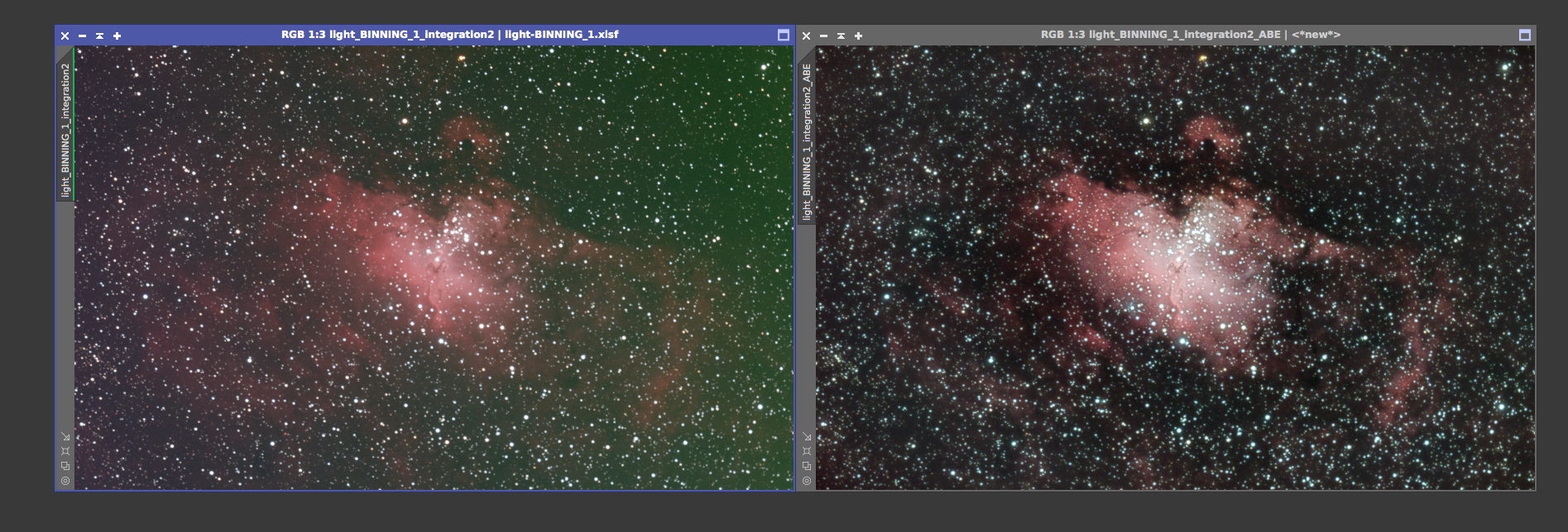 Eagle nebula On the left is the 8x5min OSC subs calibrated and combined with a screen stretch to see the faint nebulosity. On the right is the cropped and processed version from June 20, 2017